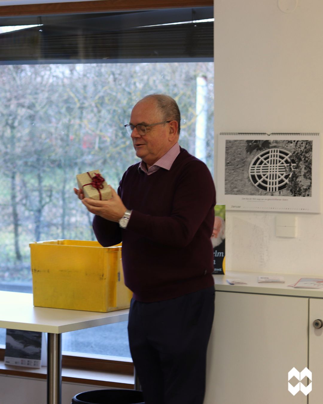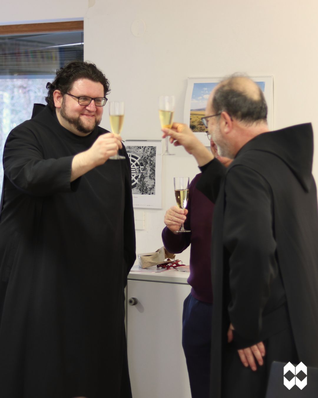 Am Donnerstagabend war Abt Michael im Verlag zu Gast, um Br. Ansgar offiziell zu verabschieden. Nach 6 Jahren als Verlagsleiter des Vier-Türme-Verlages übergibt er ab sofort sein Amt an Pater Wolfgang Sigler. In ihren Reden lobten Abt Michael und Produktionsmanager Matthias Gahr Br. Ansgar für seine ruhige und konzentrierte Art der Verlagsführung. Trotz schwieriger Umstände, wie etwa der Corona-Krise, brachte er Konstanz in den Verlag und setzte gemeinsam mit dem Verlagsteam auf neue und frische Ideen. Unter seiner Leitung feierten 2023 auch die Münsterschwarzacher Büchertrage Premiere. Mit einer eigenen Buchmesse im Kloster konnten Besucherinnen und Besucher aus nah und fern nach Münsterschwarzach gebracht und für christliche Literatur begeistert werden. Bruder Ansgar bedankte sich für die tolle Zusammenarbeit beim Verlagsteam und blickte mit Begeisterung auf die letzten 6 Jahre zurück. Zwar sei er die Leitung des Verlages gewesen, trotzdem hat er immer wieder von jedem einzelnen Mitarbeitenden etwas neues lernen können. Mit Pater Wolfgang, der bereits seit Oktober im Verlag aktiv ist, übernimmt nun die nächste Generation die Verlagsleitung. Das Verlagsteam überreichte Br. Ansgar zum Abschied einen eigens für ihn gestalteten Prägestempel, der ihn an seine Verlagszeit erinnern soll.
