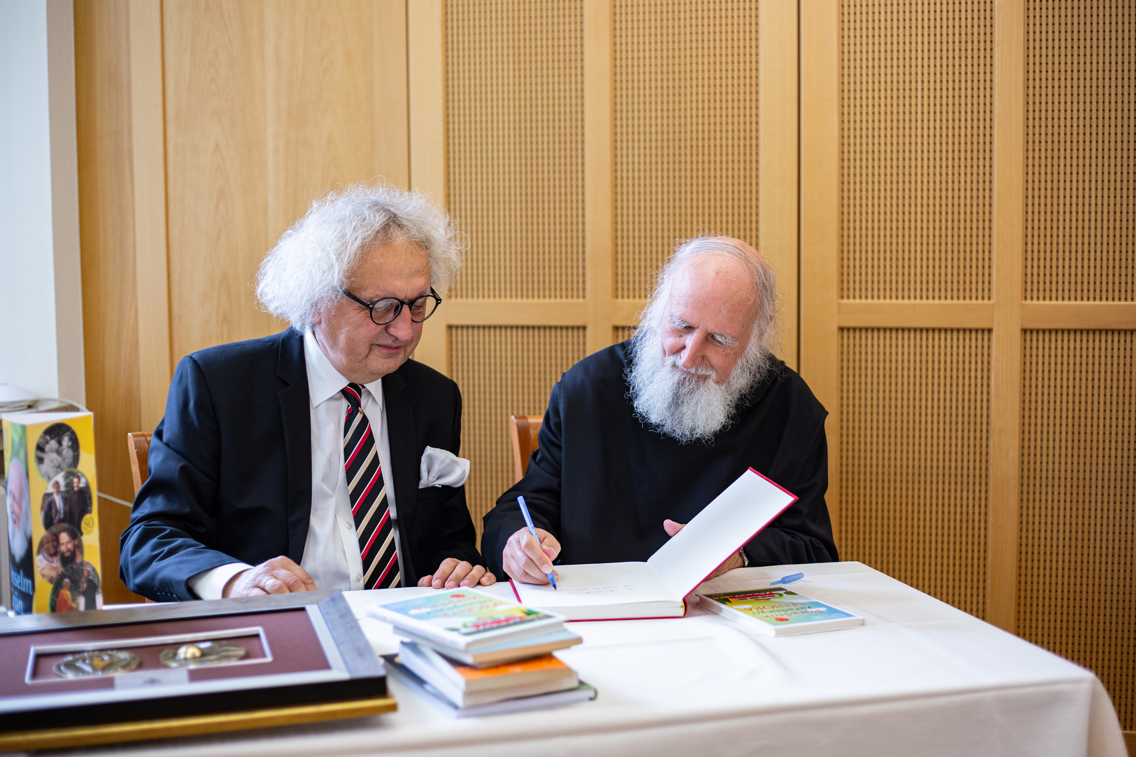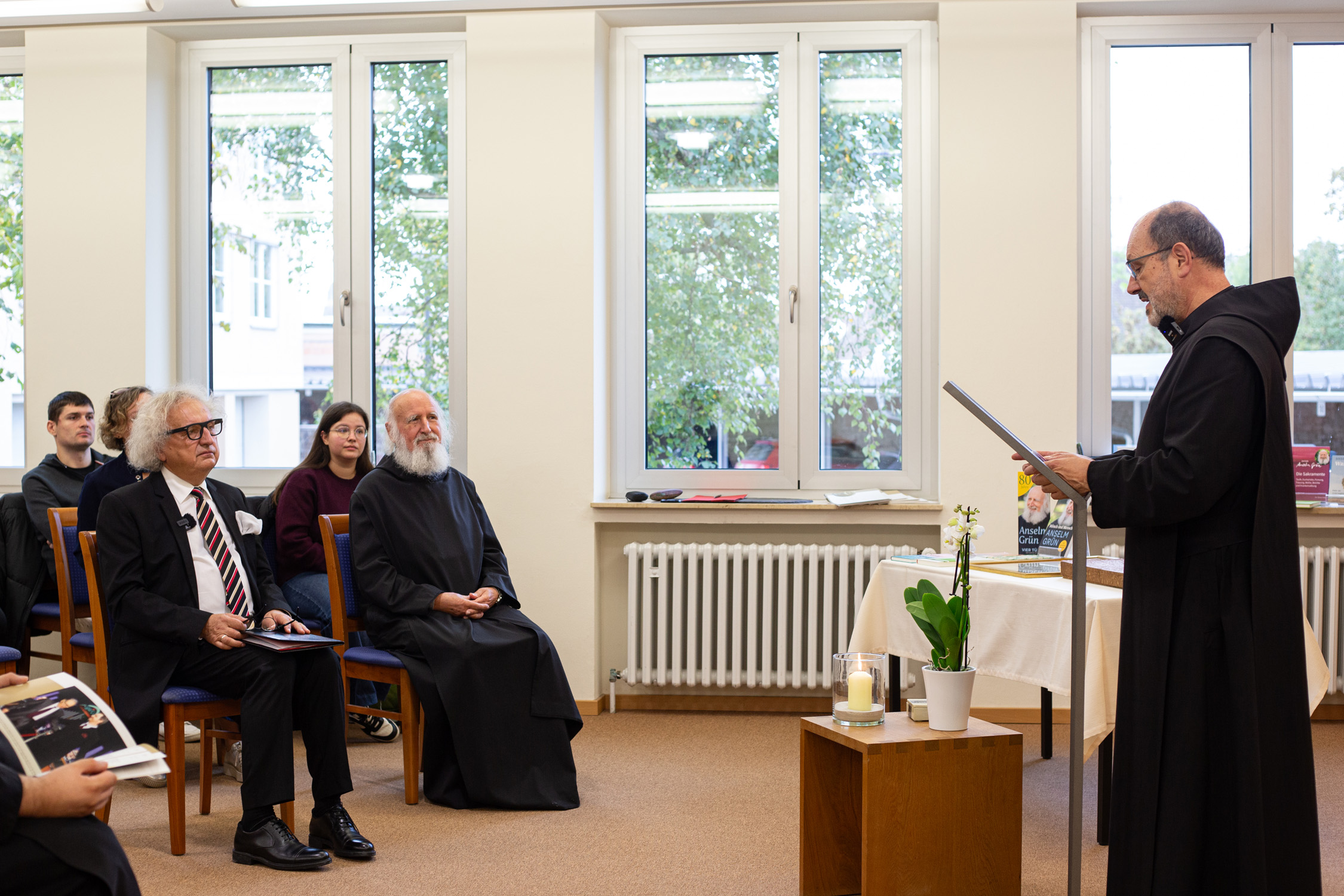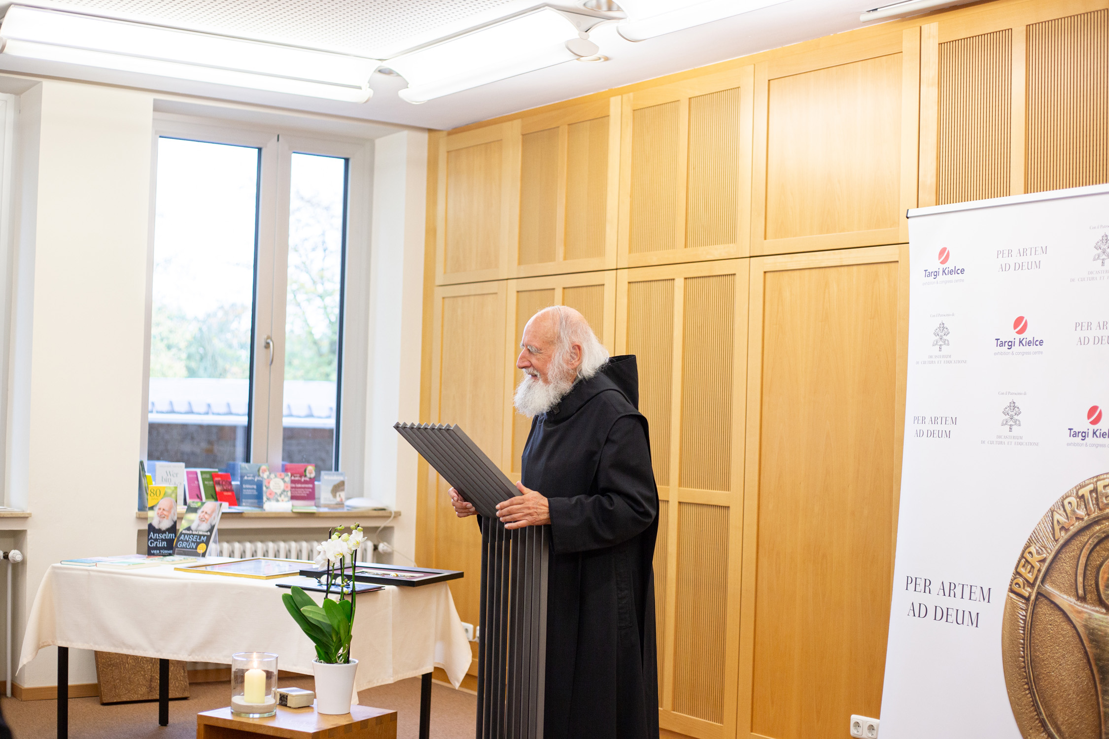In seiner Begrüßung freute sich Abt Michael Reepen über die Ehrung durch Andrzej Mochoń, Präsident der Messe Kielce (Targi Kielce) und seinem Team, die am Montag extra nach Münsterschwarzach angereist waren. Mochoń betonte in seiner Ansprache wiederum das außergewöhnliche Werk P. Anselms: „Er vermittelt den Reichtum der christlichen Botschaft an Menschen, die nach Spiritualität suchen, und bietet dabei eine neue Perspektive auf klassische religiöse Themen. Seine Werke helfen den Menschen nicht nur, das Christentum zu verstehen, sondern regen auch zu einer tieferen Reflexion über den Sinn des Lebens, den Glauben und die Stellung des Menschen in der Welt an.“
